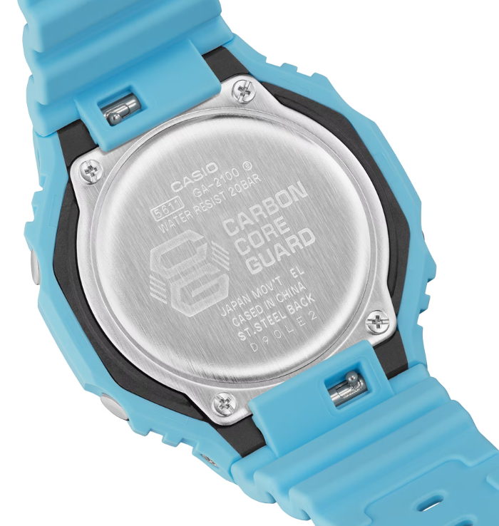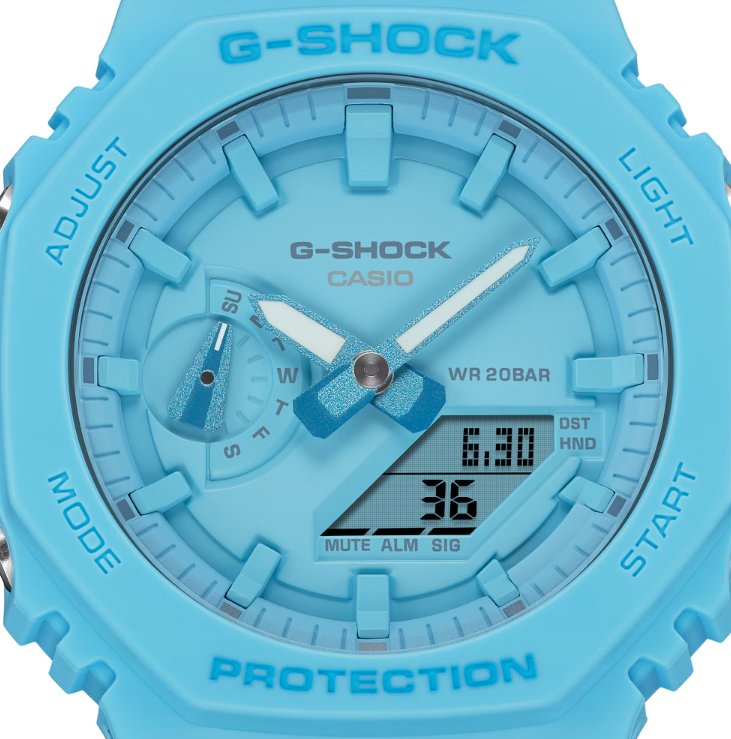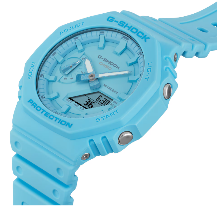 Welcome to our tone-on-tone G-SHOCK watches, dedicated to monochrome aesthetics down to the finest details. The GA-2100, with its iconic tone-on-tone style, is available in three popular colors: turquoise, white and volt yellow. The case, bezel, bracelet and even the individual dial components are crafted in subtly different shades of the same color, providing a monochromatic look with amazing depth and dimension. These colorful watches are a great fashion accessory for your street collection.