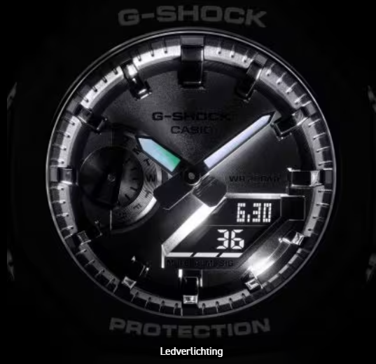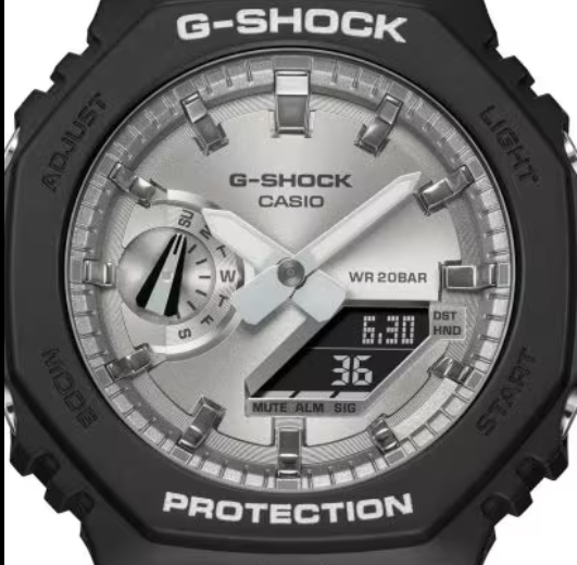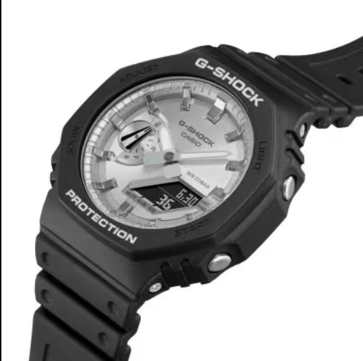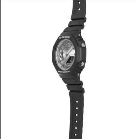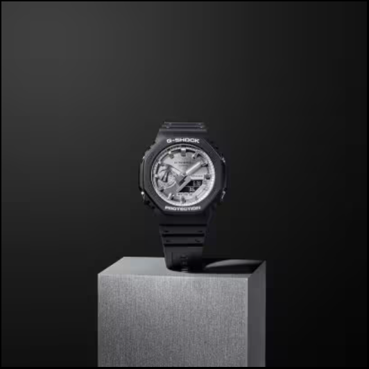 Go metal in cool, sophisticated colors with this sleek GA-2100 that's inspired by the design of the first-ever G-SHOCK. Shiny polished metallic colors meet the iconic octagonal shape of the DW-5000C, the original G-SHOCK. This strong watch combines digital and analog technology and is only 11.8 mm thick from the edge to the bottom of the case. A sleek design with the famously robust G-SHOCK construction. The dial is beautifully finished with a circular hairline finish. Like the index marks, it has been treated with a gold-colored vapor deposit. Add a bezel and band in glossy black, and you have a watch that is as striking as it is elegant.
