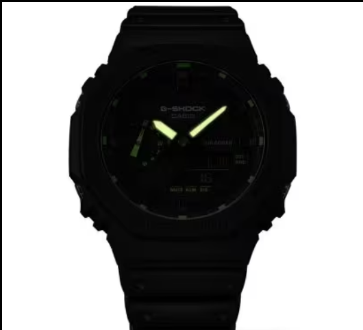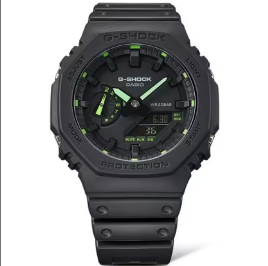 Impress with the matte black color scheme in a special design that stands out with neon accents. The GA-2100's octagonal shape and sleek design features a matte black texture and vibrant neon color for a stylish new look. Hour and minute hands with phosphorescent paint remain visible in the dark, so you can enjoy yourself day and night.